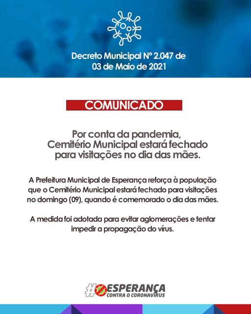 ⚠️ A Prefeitura de Esperança informa a todos os munícipes que o Cemitério estará fechado no próximo domingo, Dia das Mães, para evitar aglomerações em função da pandemia do novo Coronavírus.