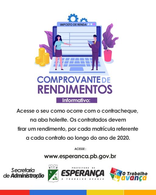 A Secretaria de Administração informa que o período para declarar o Imposto de Renda vai de 1 de março a 30 de abril de 2021. 🔸As declarações de rendimento encontram-se disponíveis no site da Prefeitura Municipal de Esperança ao acesso de todos. O acesso ocorre por meio da matrícula do servidor. ☑️No caso de contratados que possuíram mais de um contrato e, consequentemente, mais de uma matrícula durante o ano, devem baixar os rendimentos de todas as matrículas que tiveram. Não espere para o último dia para evitar congestionamentos! Prefeitura Municipal de Esperança-O trabalho avança!