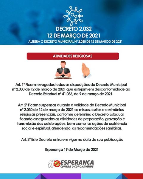 ➡️Em função de decisões judiciais que obrigaram os municípios a seguirem integralmente o último Decreto Estadual sem retirar nenhuma restrição, foi preciso atualizar o decreto municipal Nº 2.030/2021 por meio do Decreto Nº 2.032/2021 no que se refere aos cultos e missas.