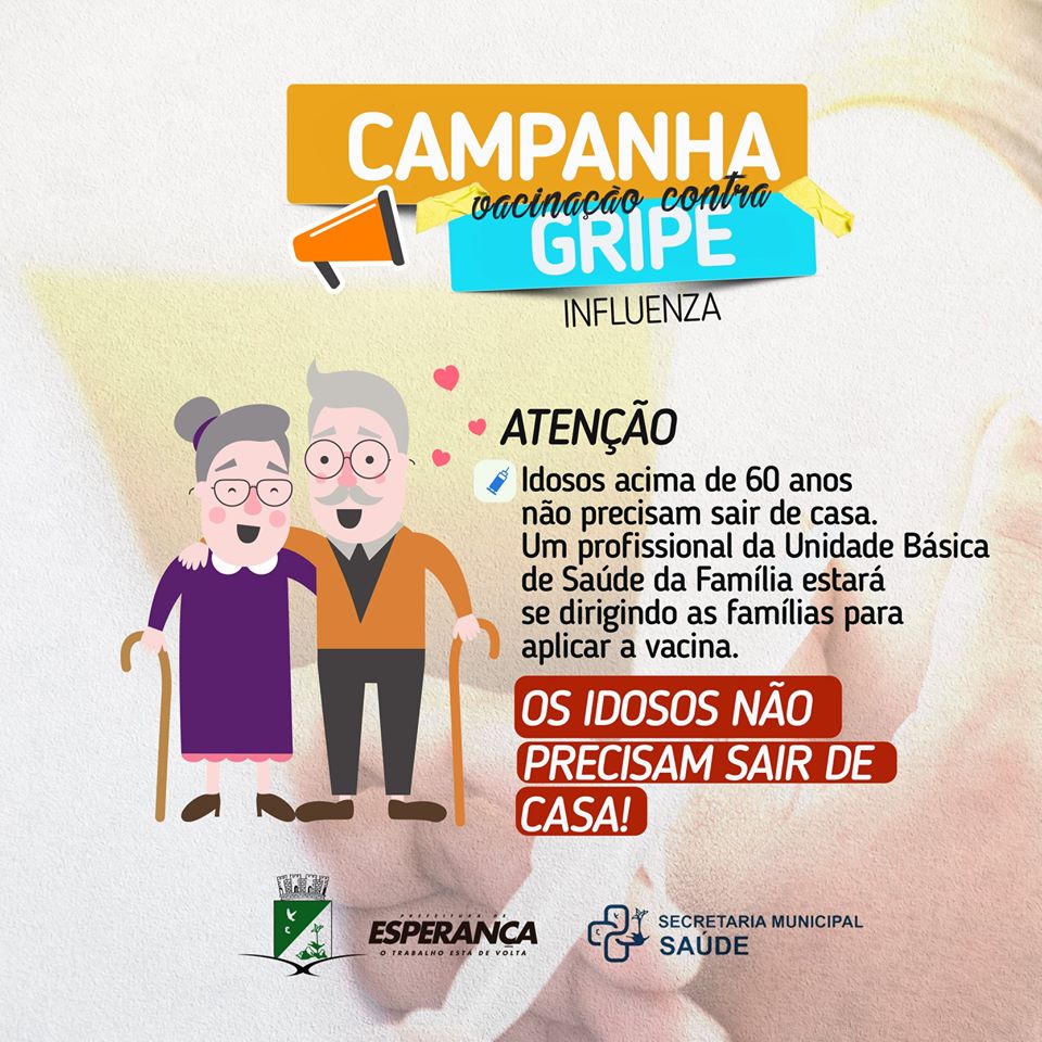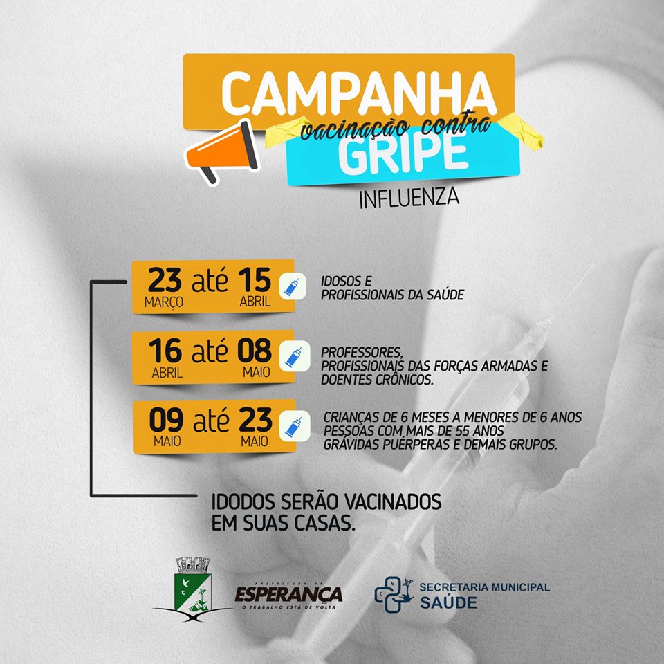 Campanha de Vacinação contra gripe começa nesta segunda-feira, 23. A campanha foi antecipada em todo o Brasil devido a pandemia do Novo Coronavírus e busca imunizar nesta primeira etapa os idosos e profissionais de saúde, para que menos pessoas sejam acometidas de síndromes gripais mais comuns, evitando assim, uma sobrecarga no sistema de saúde. Serão realizadas mais duas etapas em datas e para públicos diferentes. Para evitar ainda mais a aglomeração de pessoas nos postos, a vacinação vai acontecer em domicílio. A medida é uma recomendação do Ministério da Saúde. Reforçamos que, não é necessário ir ao posto de saúde neste momento, aguarde a equipe que irá até você. Os demais grupos não devem se preocupar com a falta de vacinas, mas estar atento as seguintes datas: De 23 de março até 15 de abril será a vez dos idosos e dos profissionais de saúde; De 16 de abril até 30 de maio, serão vacinados os professores, profissionais das forças armadas e doentes crônicos; De 09 de maio a 23 de maio, fica reservado para crianças de 6 meses a menores de 6 anos, pessoas com mais de 55 anos, grávidas, puérperas e demais grupos. A vacina contra a influenza não tem eficácia contra o Coronavírus, porém, neste momento, irá auxiliar os profissionais da saúde na exclusão para diagnóstico para Coronavírus, já que os sintomas são parecidos.