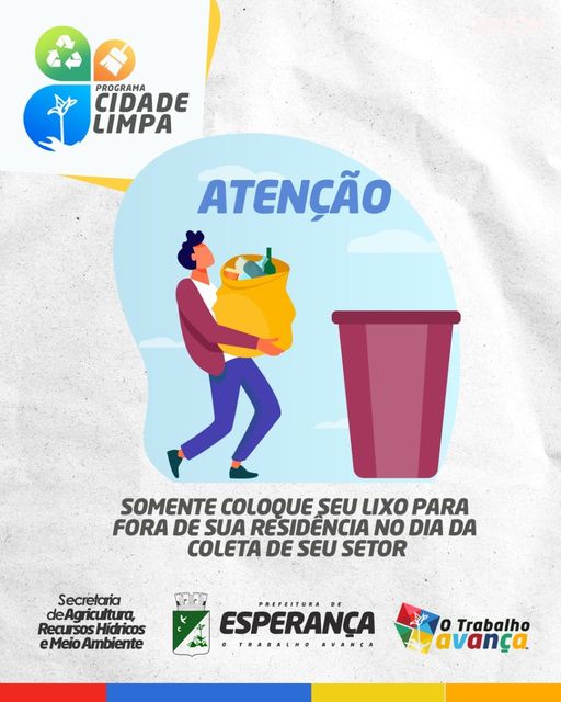🚛Solicitamos a todos os esperancenses que sigam o cronograma de coleta de lixo respeitando o horário determinado para passagem do caminhão coletor, evitando, assim, a aglomeração de lixo nas ruas da cidade. ⚠️Cada bairro e comunidade tem seus dias e horários, mas se alguns não seguirem esse calendário, o lixo ficará exposto a ação dos animais. Seja consciente, cuide de nossa cidade como cuida de sua casa. Mantenha limpa e organizada! Fazemos nossa parte, mas precisamos de sua colaboração! Prefeitura Municipal de Esperança - O trabalho avança!