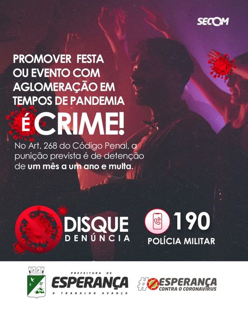 ✅Está em vigência novo decreto municipal com medidas mais restritivas à locomoção e reunião de pessoas para conter a disseminação da COVID-19. Para isso, solicitamos, que os cidadãos denunciem alguma festa, reunião ou confraternização em residências, sítios ou bares.