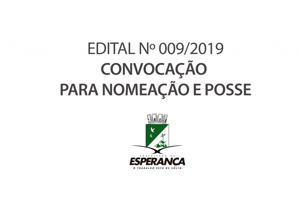O Prefeito do Município de Esperança/PB, no uso de suas atribuições legais, CONSIDERANDO a homologação do Concurso Público 2017/2018, através do Decreto Municipal nº 1.833, de 07 de maio de 2018; CONSIDERANDO a convocação dos aprovados nos Editais anteriores, RESOLVE: CONVOCAR, EM CARÁTER DE URGÊNCIA, o(a)s candidato(a)s classificado(a)s e aprovado(a)s, relacionado(a)s no ANEXO I deste Edital, munido(a)s da documentação relacionada no ANEXO II com vistas à nomeação e à posse nos cargos efetivos para comparecerem à Secretaria de Administração, no período de 10 de abril de 2019 até 09 de maio de 2019, conforme horário de atendimento informado nos anexos. A documentação dos candidatos deve ser apresentada em sua integralidade, conforme anexos que compõem este edital. Confira no link abaixo a relação com convocados.