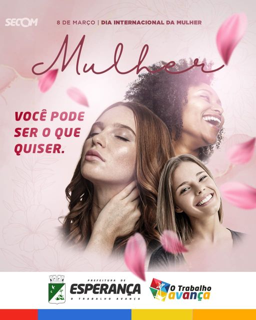 A gestão municipal parabeniza todas as mulheres guerreiras esperancenses pelo seu dia. 8 de março é apenas uma data simbólica, pois a mulher merece os 365 dias do ano em sua homenagem. Mas neste dia 8 dedicamos todas as reverências para lembrar que vocês são especiais. Mulheres que trabalham em casa, no emprego; cuidam dos filhos, do esposo; são as conselheiras da família, mulheres de fé, de peito, de garra e de esperança, mulheres que fazem um mundo mais colorido, humanizado e repleto de amor. ♥️💪Neste dia devemos lembrar também das mulheres vítimas de violência e discriminação. Que possamos combater toda forma de machismo, pois o lugar da mulher é onde ela quiser, nem na frente nem atrás, mas ao lado com direitos iguais! Prefeitura Municipal de Esperança-O trabalho avança!