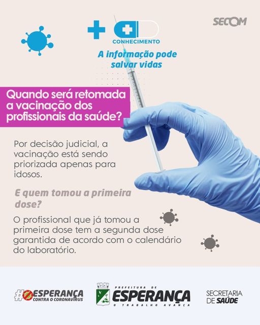 💉Por decisão judicial, nenhuma categoria pode tomar vacina antes dos idosos, nem mesmo os profissionais de saúde. Quem já tomou a primeira dose tem direito à segunda. Mas a prioridade, nas próximas remessas, é dos idosos, que compõem o grupo mais vulnerável à COVID-19.