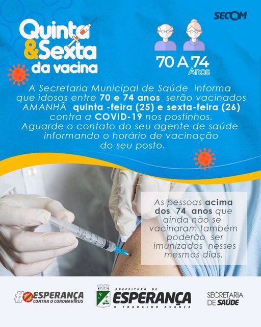 💉A Secretaria Municipal de Saúde informa que idosos entre 70 e 74 anos serão vacinados amanhã (25) e sexta-feira (26) contra a COVID-19 nos postinhos. Aguarde o contato do seu agente de saúde informando seu horário.