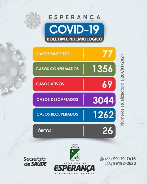 Até o momento, temos 1356 casos confirmados, 69 casos ativos, 3044 casos descartados,77 casos suspeitos,1262 recuperados e 26 óbitos. Pedimos a todos que evite sair de casa, caso seja possível. Também recomendamos a não se envolver em aglomerações de pessoas. Lembrando que os sintomas são, febre, tosse seca, dores no corpo e mal-estar, fadiga e falta de ar. Em caso de dúvidas, ligue (83) 9 9119-7416 ou (83) 9 9192-2620, estamos à disposição para te ajudar. O Município segue todos os protocolos do Ministério da Saúde (MS) para divulgação do Boletim Epidemiológico do Município. . O Boletim do Estadual pode apresentar divergências, tendo em vista o local de cadastro do cartão do SUS do usuário e/ou a realização de testes em outros municípios. Reforçamos que todos os casos estão sendo monitorados. Problema de quase todos os municípios Paraibano . A prefeitura Municipal de Esperança reforça a importância dos esperancenses procurar sua Unidade Básica de Saúde assim que os PRIMEIROS sintomas surgirem. Ao sair de casa, usar máscara.