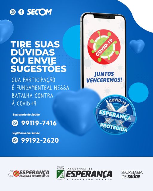 A Secretaria de Saúde e a Vigilância em Saúde dispõem, agora, de um serviço de atendimento à população com dois números para tirar dúvidas e prestar esclarecimentos sobre a pandemia de COVID-19. 🗣️O serviço também recebe sugestões para melhorar ainda mais a comunicação da gestão com os cidadãos. 😊 Prefeitura Municipal de Esperança- O trabalho avança!