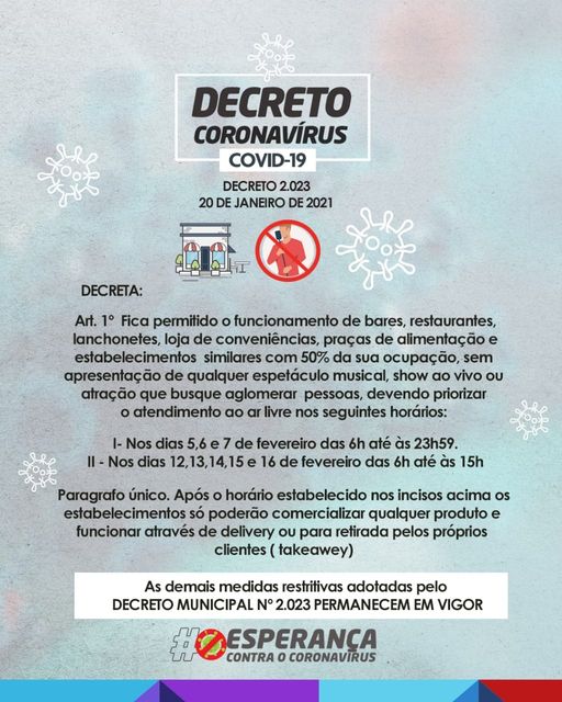 Informamos que, em função do sucesso nas medidas restritivas em que tanto proprietários de bares quanto a população respeitaram os horários de funcionamento e limitações de aglomerações nas praças, nos próximos dois finais de semana haverá uma extensão no horário de funcionamento dos estabelecimentos que poderá ser ampliada gradativamente, desde que sejam cumpridas todas as normas do Decreto Municipal.🙏 Prefeitura Municipal de Esperança- O trabalho avança!