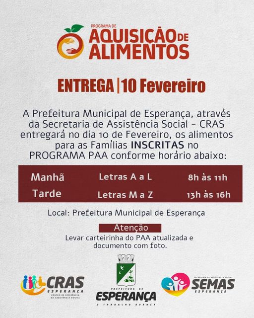 A Secretaria de Assistência Social - através do CRAS- informa que no dia 10 de fevereiro fará a entrega dos alimentos do PAA (Programa de Aquisição de Alimentos) na sede da Prefeitura Municipal de Esperança em dois horários, de acordo com a letra inicial de seu nome: A a L - das 8 às 11 horas e M a Z - das 13 às 16 horas. 👏 Para ter direito a esse kit é preciso fazer parte do programa e apresentar a carteirinha atualizada, além do RG. 🏷️ O uso de máscara e a higienização das mãos são obrigatórios.😷 Prefeitura Municipal de Esperança- O trabalho avança! ✍️: Secretaria de Comunicação/ PME #PME #CRAS #PAA #AlimentoÉVida