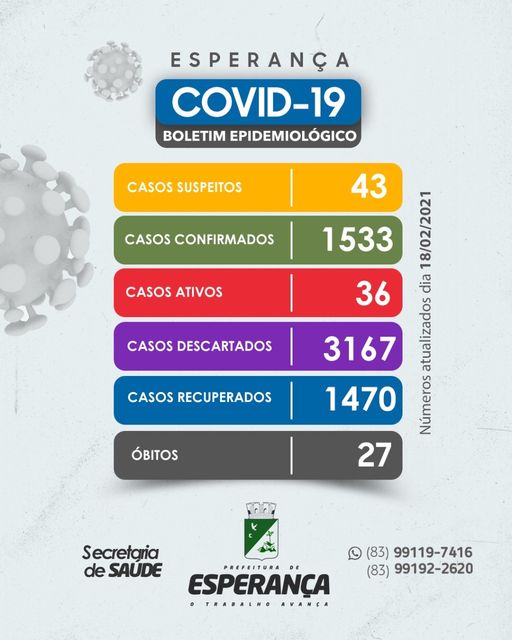 A Secretaria de Saúde de Esperança fez a atualização sobre o estado epidemiológico de Covid-19 no Município.📈