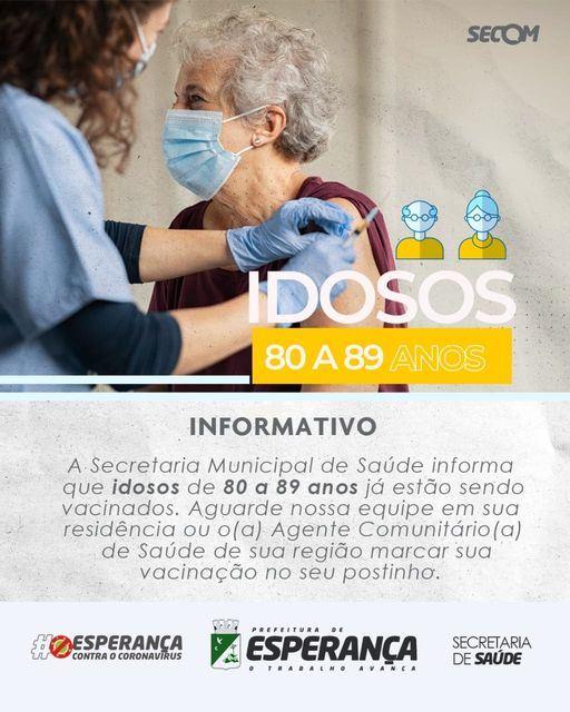 ➡️A Secretaria de Saúde segue vacinando os(as) idosos(as) do município. Atualmente estão sendo vacinados, por nossas equipes, os (as) idosos(as) entre 80 e 89 anos, através de agendamento dos(as) agentes de saúde ou em suas residências, por isso é preciso aguardar em casa o contato da sua equipe. ⚠️Todos os idosos acima de 90 anos do município já foram imunizados contra a COVID-19. Se alguém nessa faixa etária não tiver sido vacinado, deve, através de um familiar, procurar seu postinho. A nova coordenadora de imunização Priscila Geovana informa que está trabalhando para lançar novas estratégias de imunização no município, que em breve serão divulgadas para população. Prefeitura Municipal de Esperança- O trabalho avança!