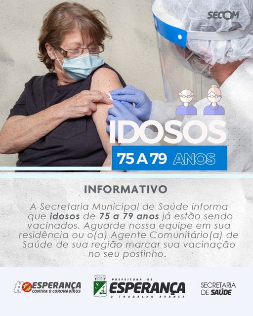 ⚠️A Secretaria de Saúde informa que deu início à vacinação contra COVID-19 para um novo grupo prioritário, graças ao recebimentos de um novo lote do imunizante. A faixa etária alcançada nessa etapa será de 75 a 79 anos. ➡️Sabemos que a população tem pressa em ser imunizada, mas as remessas vindas de Brasília ainda são bem escassas, por isso o processo ocorre paulatinamente. 😷Enquanto não chega sua vez redobre os cuidados. E aos que já se vacinaram com a primeira dose não se descuidem. Confiem na ciência, protejam-se e cuidem dos que você ama evitando aglomerações desnecessárias, pois o vírus é mortal! Prefeitura Municipal de Esperança- O trabalho avança!