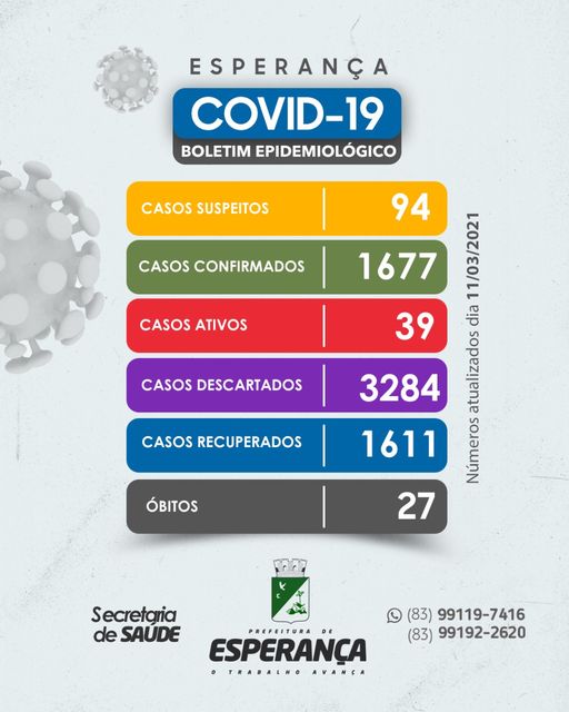A Secretaria de Saúde de Esperança fez a atualização sobre o estado epidemiológico de Covid-19 no Município.📈