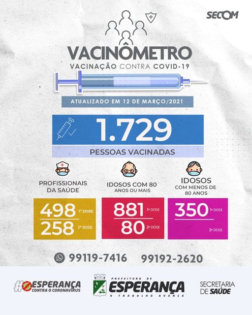 ↪️Os números são atualizados de acordo com as remessas de vacinas enviadas aos municípios, que, no momento, ainda são bem escassas. Prefeitura Municipal de Esperança-O trabalho avança!