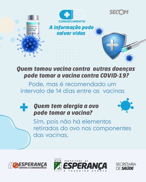 ↪️A Secretaria de Saúde esclarece algumas dúvidas a respeito da vacinação contra a COVID-19: quem tomou algum imunizante contra outras doenças pode sim tomar esta nova, desde que espere um intervalo de 14 dias e explica também que quem tem alergia a ovo pode tomar sem problemas.