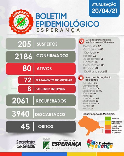 A Secretaria de Saúde de Esperança fez a atualização sobre o estado epidemiológico de Covid-19 no Município.📈