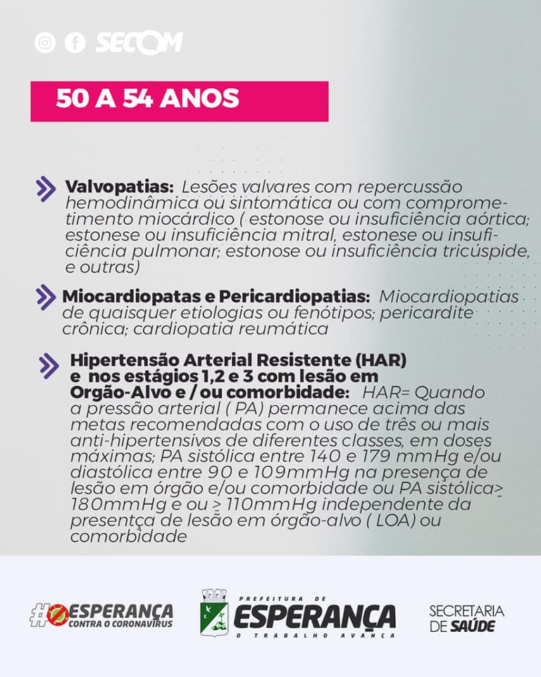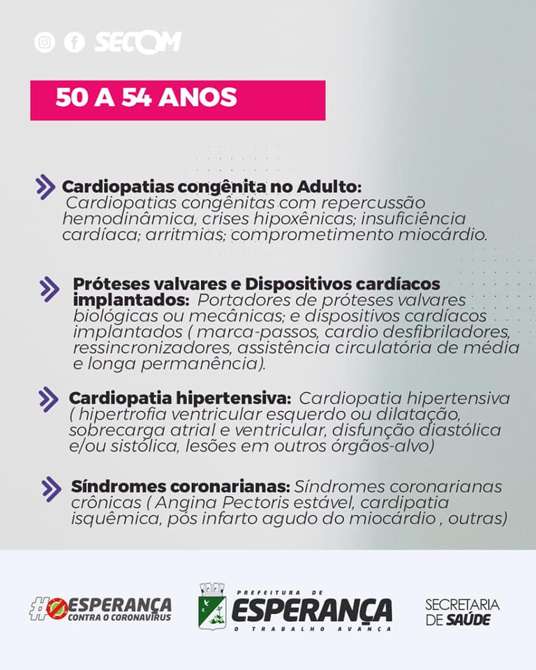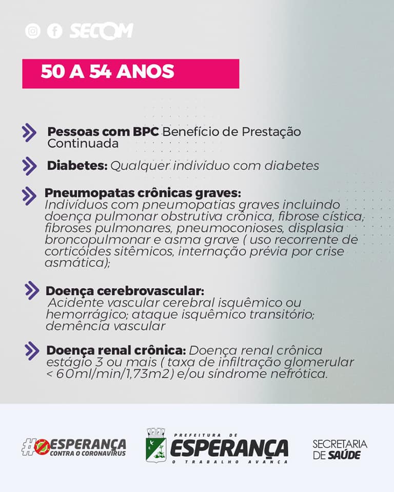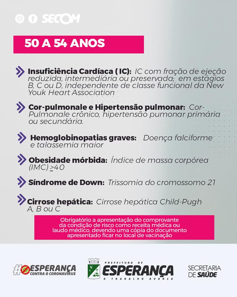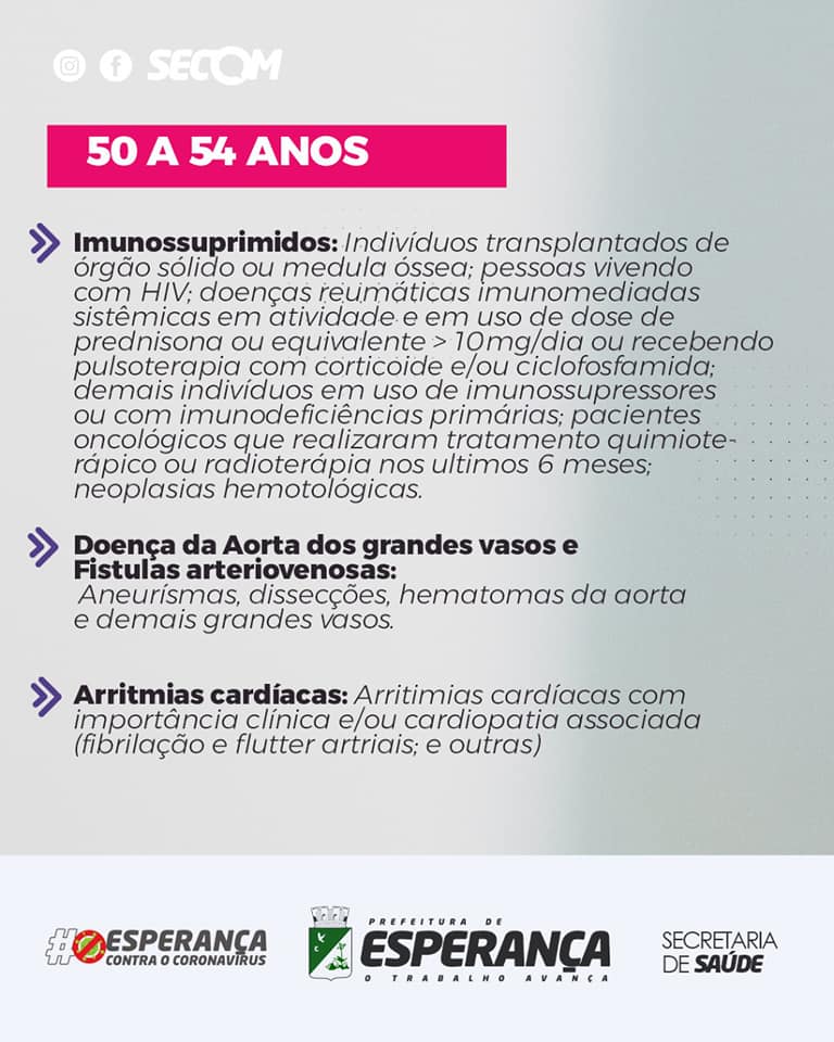 ⚕️A Secretaria de Saúde informa a todos os munícipes que continua imunizando a população entre 50 e 54 anos contra a Covid-19.