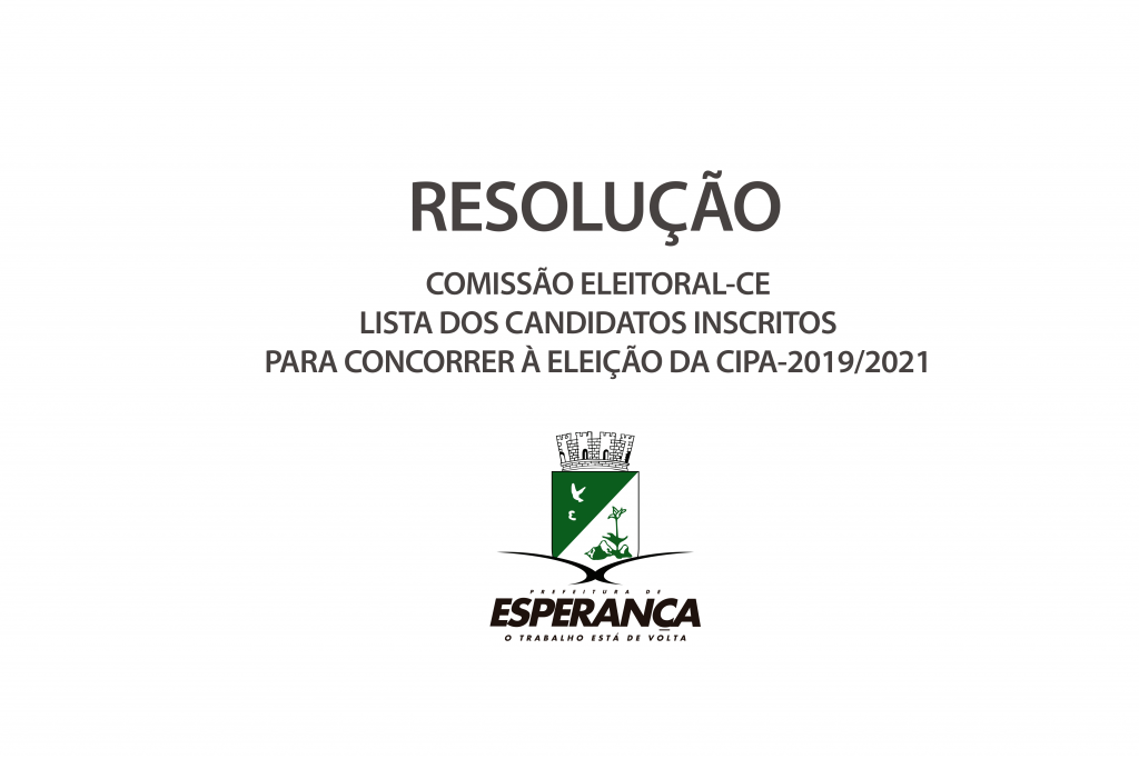 A Comissão Eleitoral formada para coordenar o processo de escolha de membros da Comissão Interna de Prevenção de Acidentes/CIPA, gestão 2019/2021, da Prefeitura Municipal de Esperança.