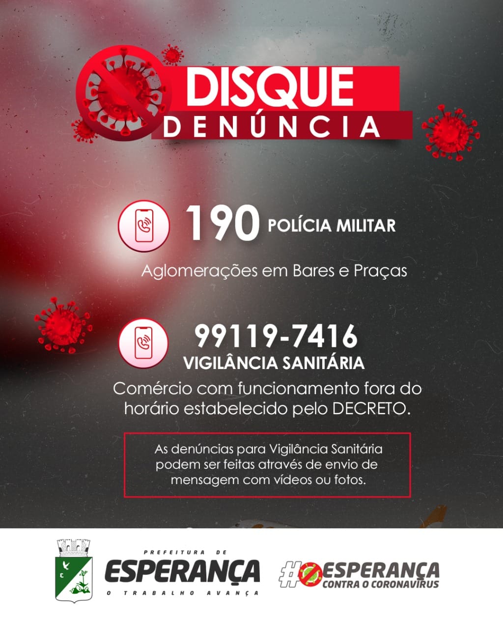 A pandemia de COVID-19 está evoluindo rapidamente, mas, infelizmente, muitas pessoas ainda não estão levando a situação a sério e continuam promovendo festas clandestinas e grandes aglomerações em suas residências e sítios. ☎️📱Para combater essa situação, disponibilizamos os números para denúncias, que são: Polícia: 190 e Vigilância Sanitária: 99119-7416. 🔊Faça sua parte! Denuncie! Não adianta silenciar quando presencia alguma irregularidade e reclamar em rede social no dia seguinte. ✅Chame as autoridades, você estará fazendo pelo seu bem e pelo bem de todos. Em uma aglomeração, uma pessoa, mesmo assintomática, pode contaminar diversas outras. Lembre-se: As UTIs estão chegando ao pico de ocupação! Prefeitura Municipal de Esperança: O trabalho avança!