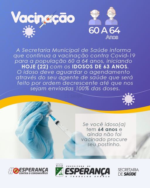 👵🏽👴🏼Atualmente o grupo prioritário é dos 60 a 64 anos, e vamos vacinando ano a ano, hoje é a vez dos esperancenses de 63.
