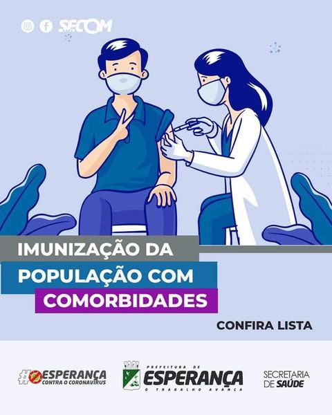 ⚕️A Secretaria de Saúde informa que segue vacinando, esta semana, os portadores de comorbidade entre 55 e 59 anos.