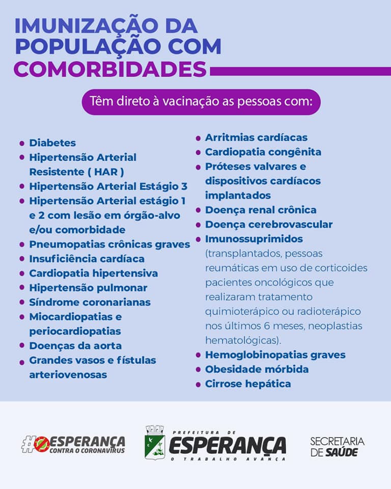↘️As comorbidades estão descritas nos banners abaixo e são determinadas pelo Ministério da Saúde. Lembrando que só fará jus à vacinação, neste momento, quem comprovar a doença através de laudo médico.