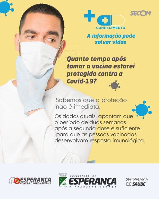 ↪️A Secretaria de Saúde informa aos esperancenses, que já foram vacinados, que existe um prazo para a imunização fazer efeito. Somente 15 dias após a segunda dose esse processo se completa.