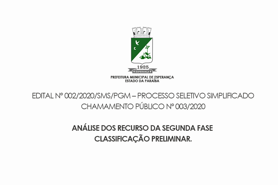 EDITAL Nº 002/2020/SMS/PGM – PROCESSO SELETIVO SIMPLIFICADO CHAMAMENTO PÚBLICO Nº 003/2020 ANÁLISE DOS RECURSO DA SEGUNDA FASE – CLASSIFICAÇÃO PRELIMINAR.
