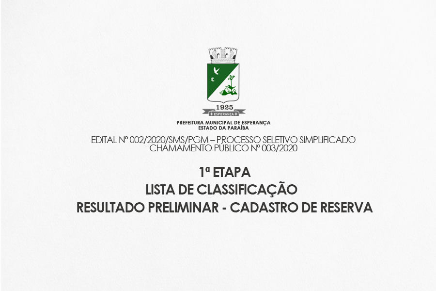 EDITAL Nº 002/2020/SMS/PGM – PROCESSO SELETIVO SIMPLIFICADO CHAMAMENTO PÚBLICO Nº 003/2020 1ª ETAPA LISTA DE CLASSIFICAÇÃO – RESULTADO PRELIMINAR - CADASTRO DE RESERVA