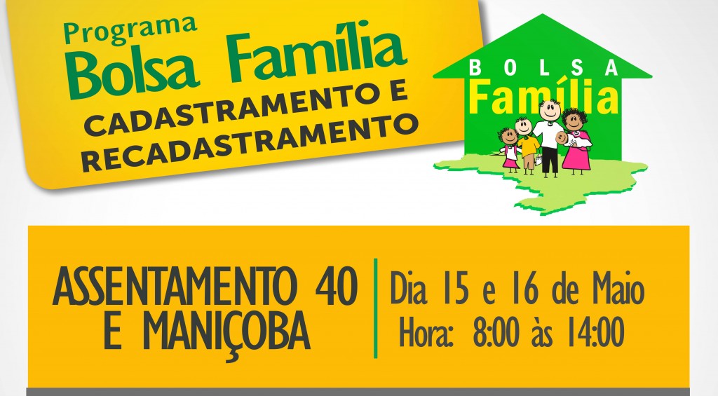 A Prefeitura Municipal de Esperança, através da Secretaria de Ação Social nos dias 15 e 16 o Cadastramento e Recadastramento do Programa Bolsa Família nas comunidades do Assentamento do 40 e Manissoba. A secretária de assistência social, Taiana Grangeiro, reforça a importância das famílias não perderem os dias do cadastramento e recadastramento em suas regiões. O horário será de 8h às 14h. Fiquem atentos aos documentos necessários.