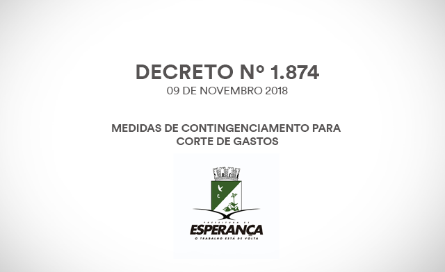 Decreto nº 1.874, de 09 de Novembro de 2018. Dispõe sobre as medidas de contingenciamento para o eficaz "corte de gastos" em todos os âmbitos da administração, objetivando o equilíbrio financeiro das contas municipais, de forma que sejam cumpridas as metas orçamentárias estipuladas pela legislação pertinente.