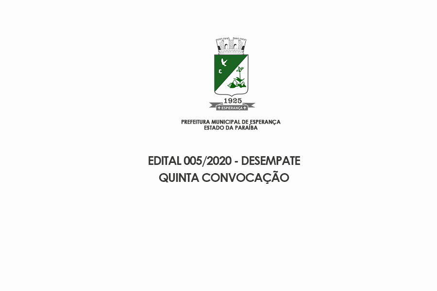 EDITAL 005/2020 - DESEMPATE QUINTA CONVOCAÇÃO. O Prefeito do Município de Esperança/PB, no uso de suas atribuições legais, considerando a homologação do Concurso Público 2017/2018, através do Decreto Municipal nº 1.833, de 07 de maio de 2018, CONSIDERANDO os Editais de Convocação para Nomeação e Posse 001 a 030, publicados entre 13 de junho de 2018 e 24 de junho de 2020, em edições extras e nos respectivos Quinzenários Oficiais; CONVOCA, os candidatos habilitados, relacionados abaixo para, com vistas ao desempate.