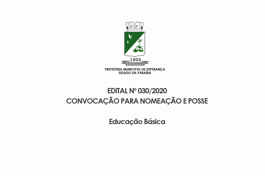 EDITAL Nº 030/2020 CONVOCAÇÃO PARA NOMEAÇÃO E POSSE O Prefeito do Município de Esperança/PB, no uso de suas atribuições legais, Considerando a homologação do Concurso Público 2017/2018, através do Decreto Municipal nº 1.833, de 07 de maio de 2018; Considerando a convocação de classificados e aprovados em Editais anteriores, bem como de Desempates: RESOLVE: CONVOCAR, EM CARÁTER DE URGÊNCIA, a senhora MÔNICA GANGORRA DE PAULA DUARTE, aprovada neste Concurso Público em 41º lugar, para o cargo efetivo de PROFESSOR DE EDUCAÇÃO BÁSICA