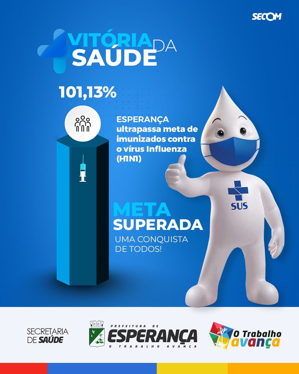 Esse resultado é mérito do prefeito Nobinho Almeida que sempre empreendeu todos os esforços para trazer vacina para a cidade e realizar grandes ações de combate não só à Covid, mas a todas as doenças. Hoje Esperança tem saúde!