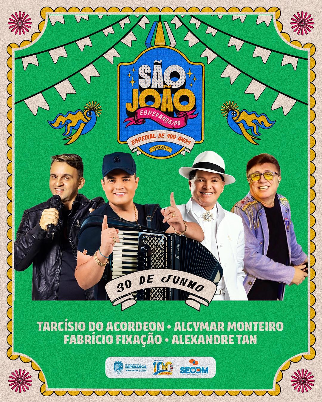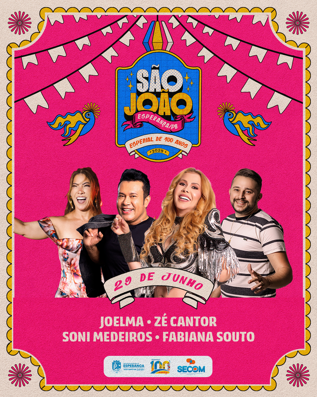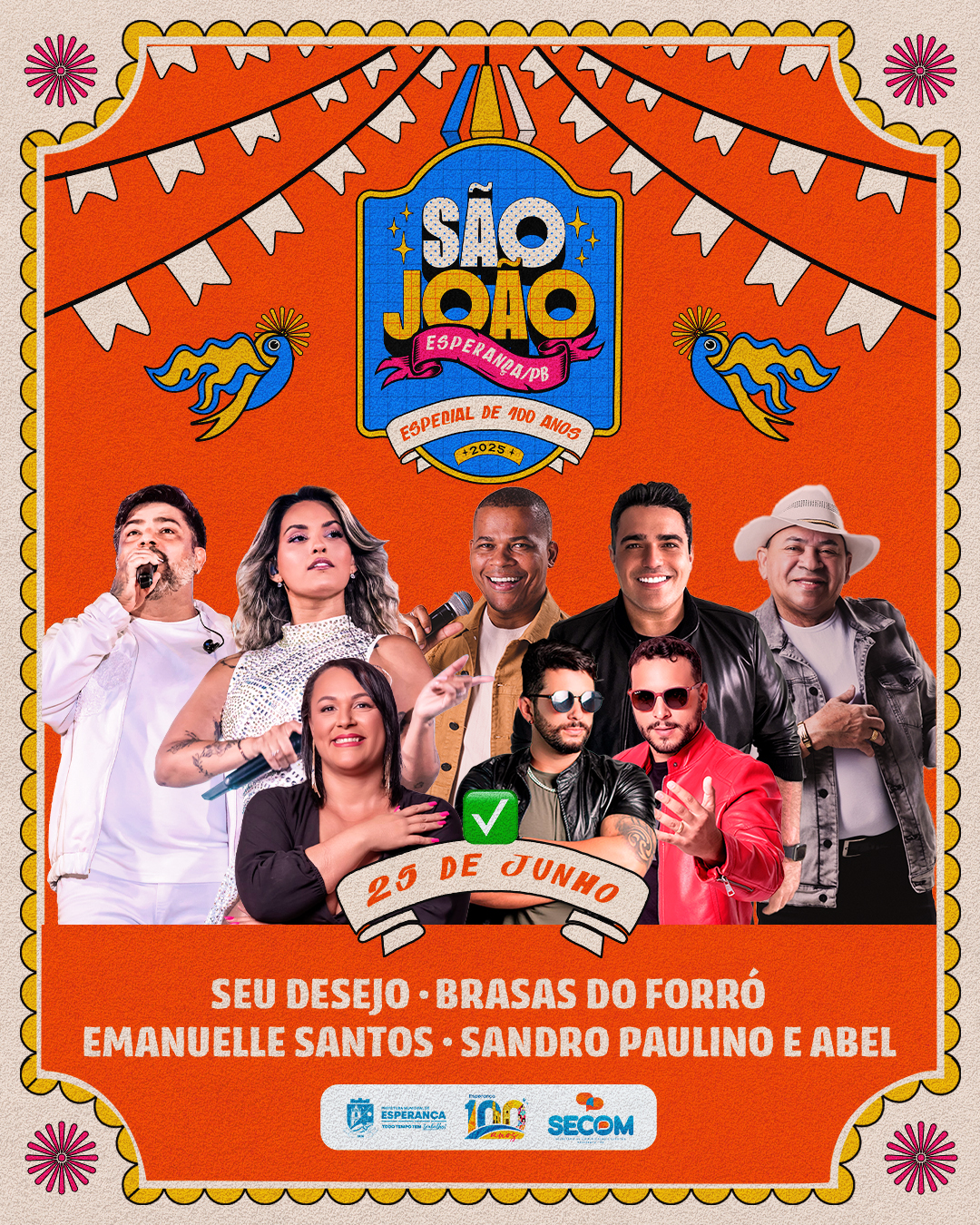 A Prefeitura Municipal de Esperança tem a honra de anunciar a programação oficial do São João do Centenário, uma edição histórica que celebra os 100 anos do município com seis noites de festa, cultura, tradição e grandes atrações. De 25 a 30 de junho, a cidade será palco de um dos eventos mais esperados do ano, reunindo milhares de pessoas na Praça de Eventos para vivenciar momentos inesquecíveis.