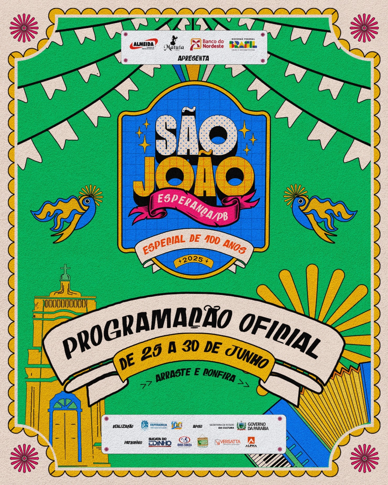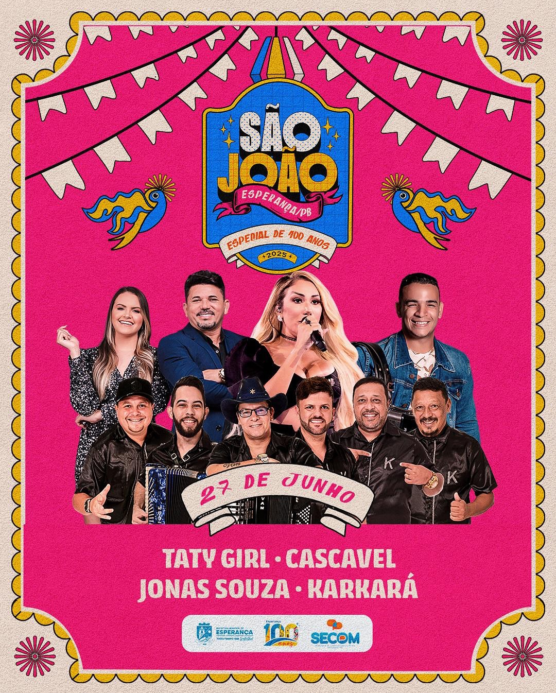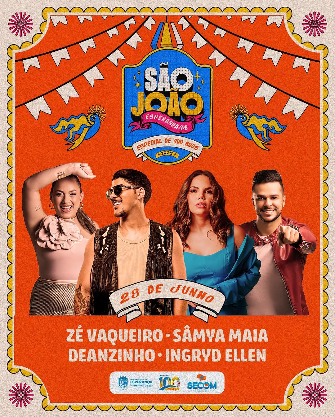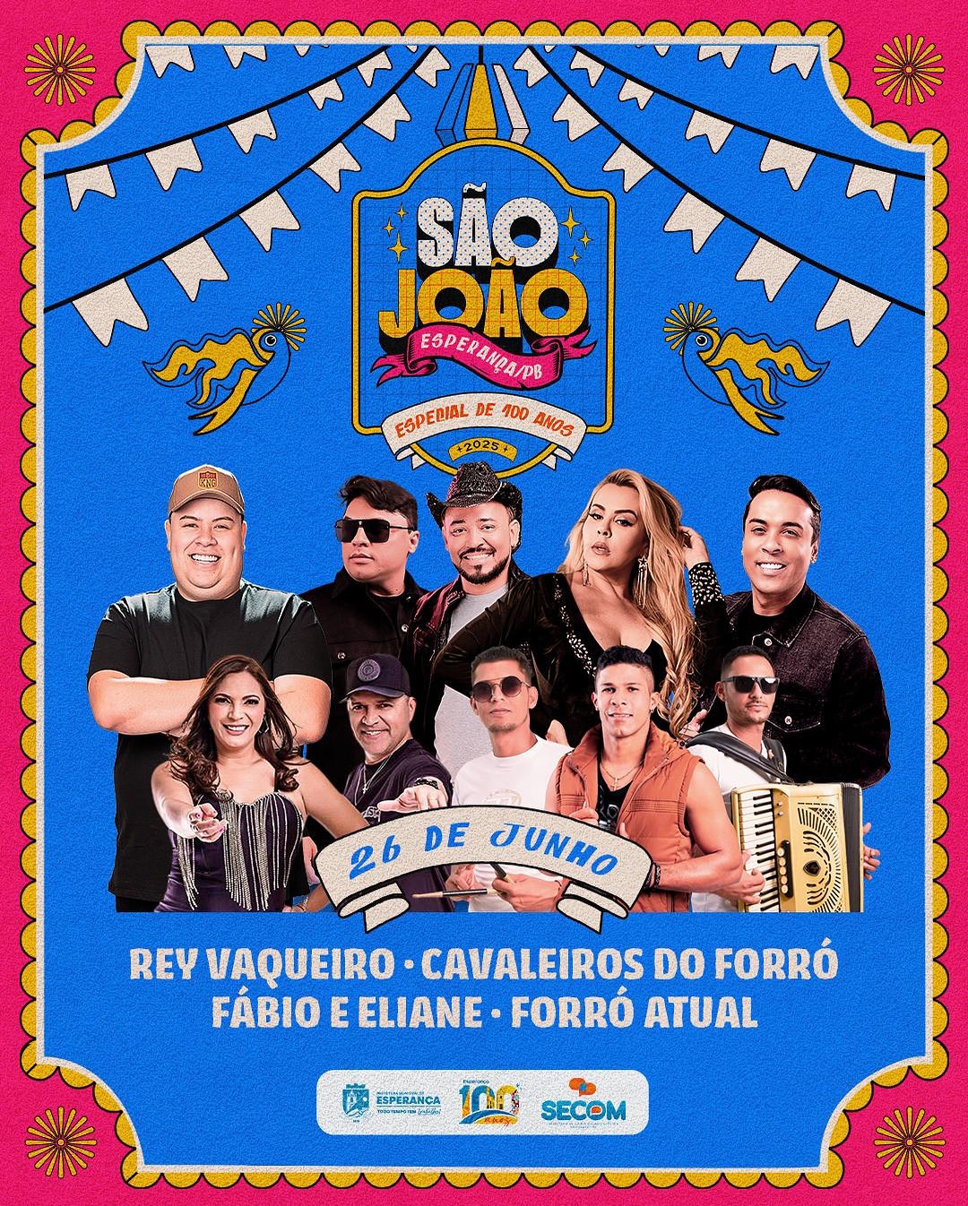 A Prefeitura Municipal de Esperança tem a honra de anunciar a programação oficial do São João do Centenário, uma edição histórica que celebra os 100 anos do município com seis noites de festa, cultura, tradição e grandes atrações. De 25 a 30 de junho, a cidade será palco de um dos eventos mais esperados do ano, reunindo milhares de pessoas na Praça de Eventos para vivenciar momentos inesquecíveis.