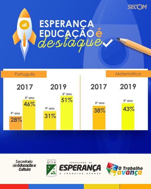 📝A Secretaria de Educação e Cultura está colhendo os frutos do trabalho realizado nos últimos quatro anos com crescimento nas avaliações federais realizadas com nossos alunos. 🔸Este é o resultado da proficiência da Prova Saeb, uma avaliação nacional de Português e Matemática com alunos de 5º e 9º ano e que condiciona a nota do IDEB e, consequentemente, atesta a qualidade da Educação dos municípios. 👏Esperança apresentou estabilidade em Matemática do 9ºano, além de amplo crescimento de Português e Matemática no 5º e 9º ano, conforme mostram os números disponíveis no site do INEP. Além do elevado crescimento, ainda apresentamos índices acima da média da Paraíba e do Brasil. Esperança de uma Educação cada vez mais transformadora e inclusiva. Prefeitura Municipal de Esperança- O trabalho avança!
