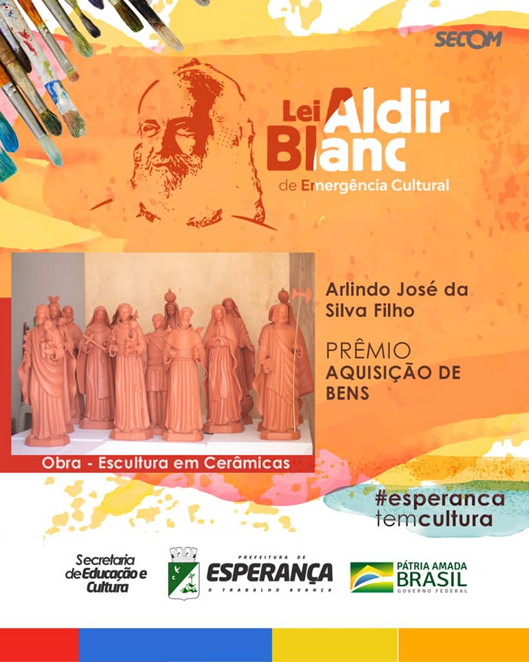 ↪️Conheça hoje as obras de arte premiadas no edital Aquisição de Bens através da Lei Cultural Aldir Blanc para o município de Esperança. "Nosso município, por meio da LAB, recebe obras de arte as quais estarão disponíveis para visitação da população logo que passarmos esse período de pandemia. São obras de artistas que traduzem em suas telas o universo regional e nordestino", comentou André Oliveira, diretor de cultura de Esperança.