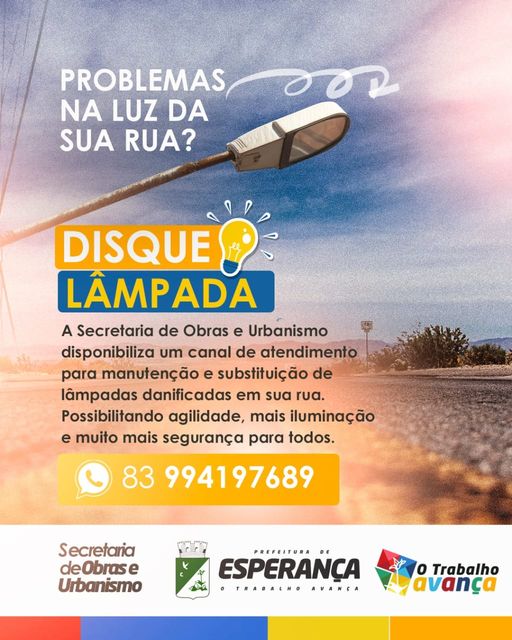 💡 Agora os esperancenses têm um número de telefone a seu dispor para solicitar a reposição de lâmpadas danificadas em suas ruas. ✨Esperança, hoje, é uma cidade iluminada e, com sua participação, vai brilhar mais ainda. Contato: 99419-7689 Prefeitura Municipal de Esperança - O trabalho avança!