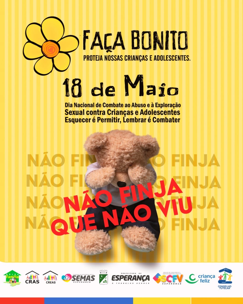 “Não finja que não viu” é um tema que visa combater o silêncio de quem presencia tais atos e não denuncia.