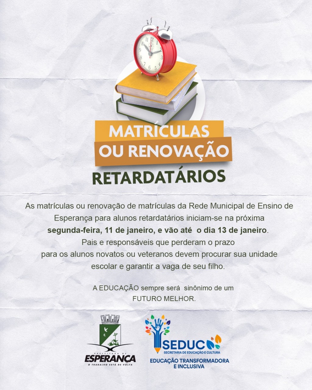 As matrículas ou renovação de matrículas da Rede Municipal de Ensino de Esperança para alunos retardatários iniciam-se na próxima segunda-feira, 11 de janeiro, e vão até o dia 13 de janeiro. Pais e responsáveis que perderam o prazo para os alunos novatos ou veteranos devem procurar sua unidade escolar e garantir a vaga de seu filho. Prefeitura Municipal de Esperança - Educação Transformadora e inclusiva.