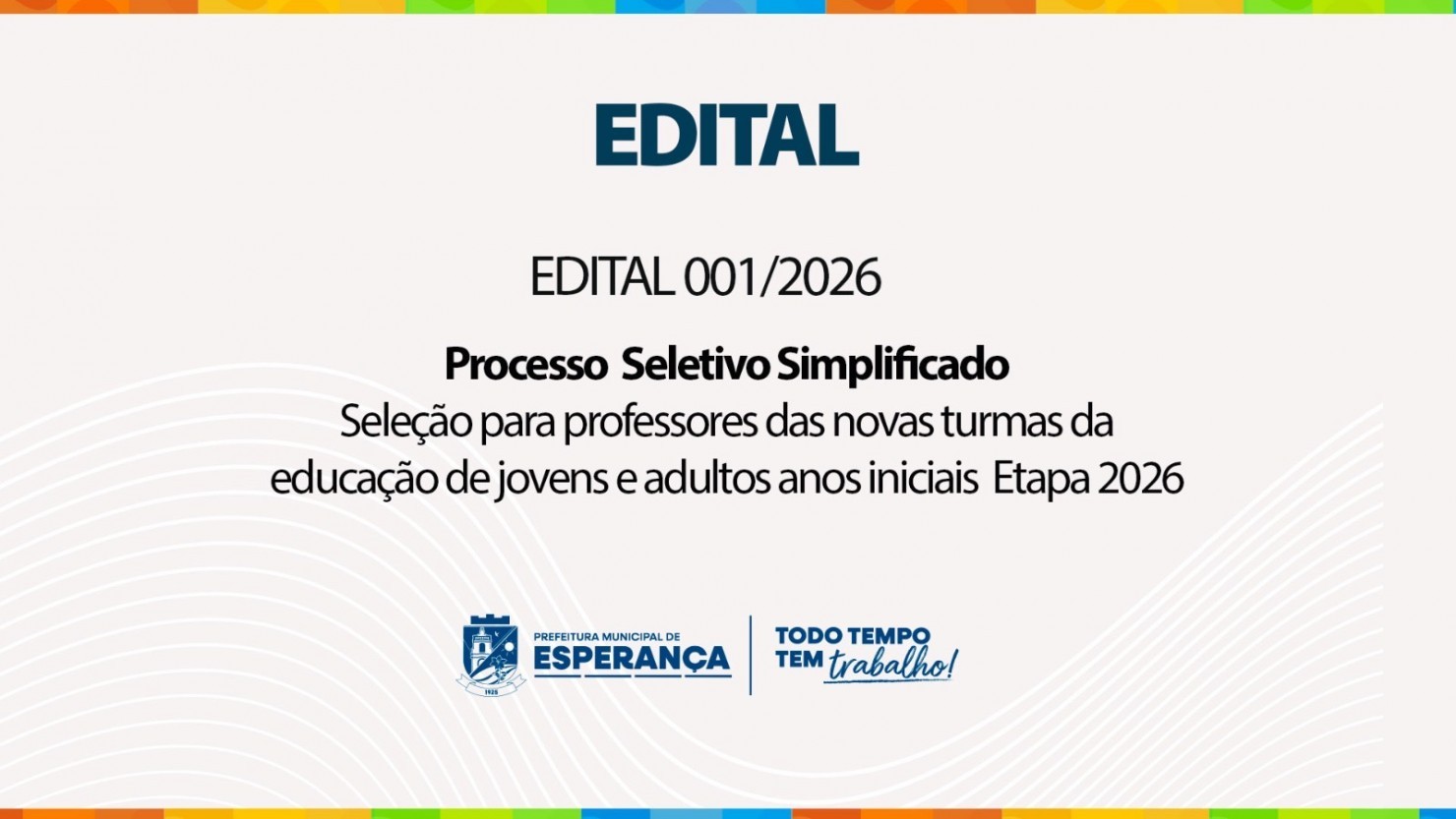 Com o compromisso de fortalecer a educação e ampliar oportunidades de aprendizagem para jovens e adultos do município, a gestão municipal lança seleção destinada ao preenchimento de 50 vagas para professores da modalidade EJA, sendo 25 para a zona urbana e 25 para a zona rural.