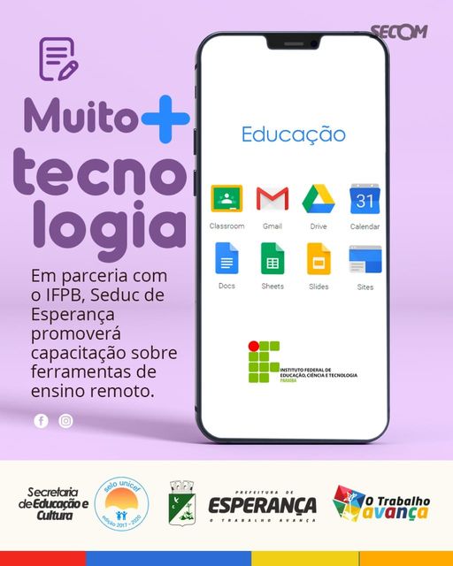 ✏️A Secretaria de Educação e Cultura, promoverá, em parceria com o IFPB de Esperança, capacitação sobre as ferramentas online para os professores da rede municipal de ensino.