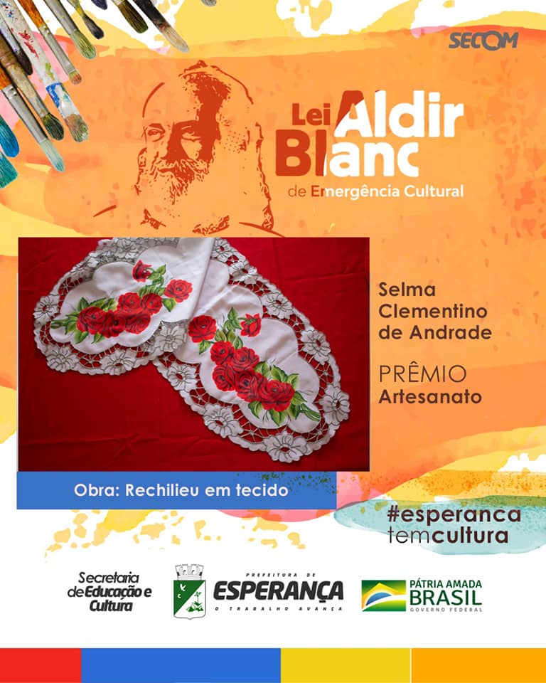 "Ficamos muito felizes em premiar artesãos de nosso município através da Lei Aldir Blanc, pois é uma forma de valorização e incentivo do trabalho artesão local", disse André Oliveira, diretor de Cultura de Esperança.