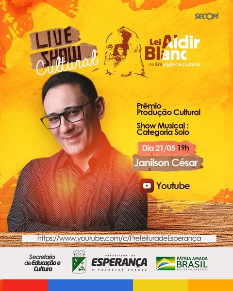 ✅ Chegou mais uma sexta-feira e teremos mais lives culturais com artistas locais premiados pelo Lei Aldir Blanc. Os artistas dessa sexta são Janilson César (categoria Solo) e Rafaela Costa e Sandro Show (categoria dupla), ambos premiados no edital Produção Cultural na área de música. Acesse o canal do YouTube da Prefeitura Municipal de Esperança a partir das 19h para conferir os shows deles. "Na tentativa de driblar as perdas ocasionadas pelo Covid-19, através da Lei Aldir Blanc, os artistas locais levam para nos lares esperancenses um repertório seleto com músicas de cantores e compositores renomados. Vamos prestigia-los", destacou André Oliveira, diretor de cultura de Esperança.