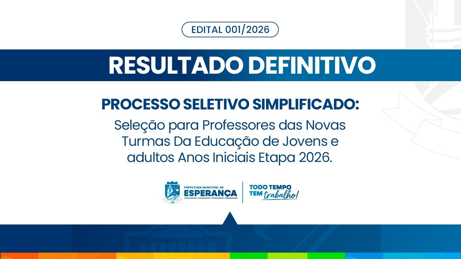 A Prefeitura Municipal de Esperança divulga o Resultado Definitivo do Processo Seletivo Simplificado – Edital nº 001/2026, destinado à seleção de professores para atuação nas novas turmas da Educação de Jovens e Adultos (EJA) – Anos Iniciais, etapa 2026.