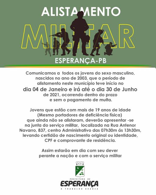 Para vocês do sexo masculino🧒🏻 que nasceram no ano de 2003 chegou o momento do alistamento militar e retirada da carteira de reservista no período de 4 de janeiro a 30 de junho🗓️ ⚠️Procurem a Junta Militar localizada no Centro Administrativo do município munidos de certidão de nascimento, CPF e comprovante de residência. Os que estão acima de 19 anos e nunca se alistaram devem regularizar sua situação. Prefeitura Municipal de Esperança - O trabalho avança! ✍️Secretaria de Comunicação/PME