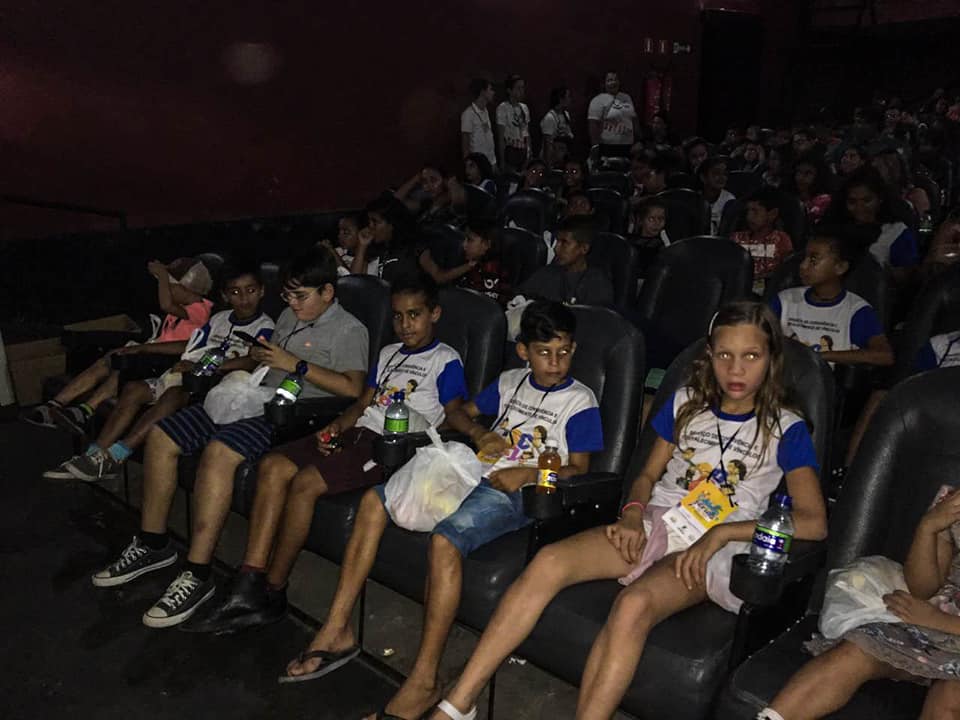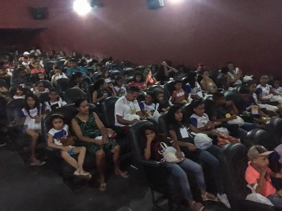 As crianças e adolescentes tiveram a oportunidade de ir pela primeira vez ao cinema acompanhados de um delicioso lanche para toda criançada .
