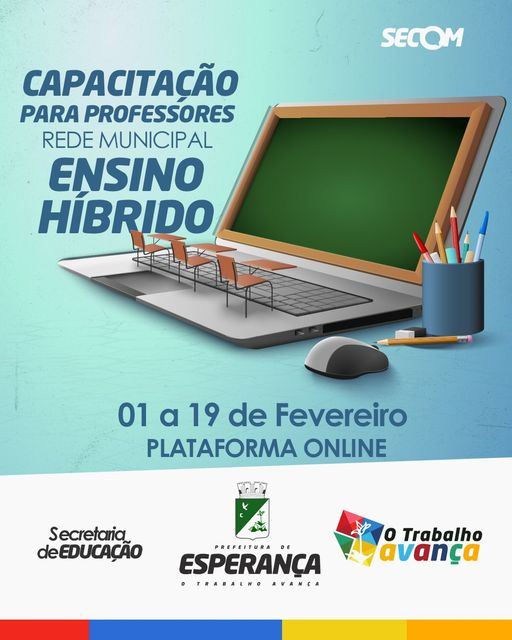 A Secretaria de Educação e Cultura informa que entre 1° e 19 de fevereiro será realizado um curso de capacitação para os profissionais de toda a rede municipal sobre o Ensino Híbrido.🖥️📱 ⚠️Público alvo da Educação: professores, coordenadores, orientadores, supervisores, diretores, adjuntos, assistentes sociais e psicólogos. Após esse curso os profissionais estarão capacitados para ministrar o ensino híbrido no município. 👏 Esperança, segue assim, conectada, antenada com a realidade e ofertando uma educação transformadora e inclusiva.📚✏️ Prefeitura Municipal de Esperança- O trabalho avança!